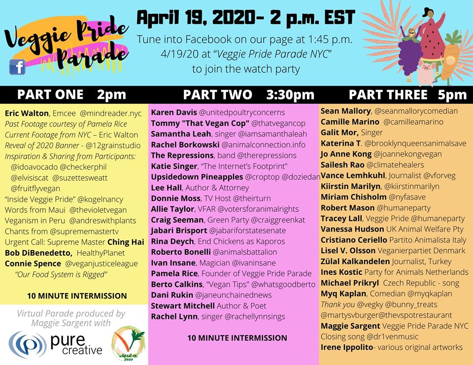 As you might remember, I march and speak at the NYC Veggie Pride Parade event annually and would normally be up in NYC this weekend! Well, now everyone can be present for the live, online event. Kudos to Maggie Sargent, with support from Joel Mittentag, for producing the event online. NEW DATE! To attend live online this Sunday, 19 April 2020, go here: