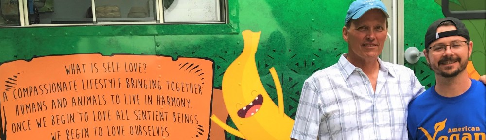 Special solstice post inspired by patrons and supporters. Photo: Harold and Vinnie beside the SelfLoveVegan food truck at the 2018 American Vegan Society annual general meeting and garden party, by Lee.