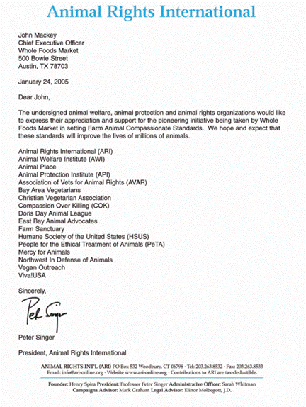 Next, Whole Foods Market posted and circulated a statement in the form of a letter from Animal Rights International (ARI) to John Mackey, dated 24 January 2005, with the release titled Animal Rights Groups Express Support for Animal Compassion Foundation.
